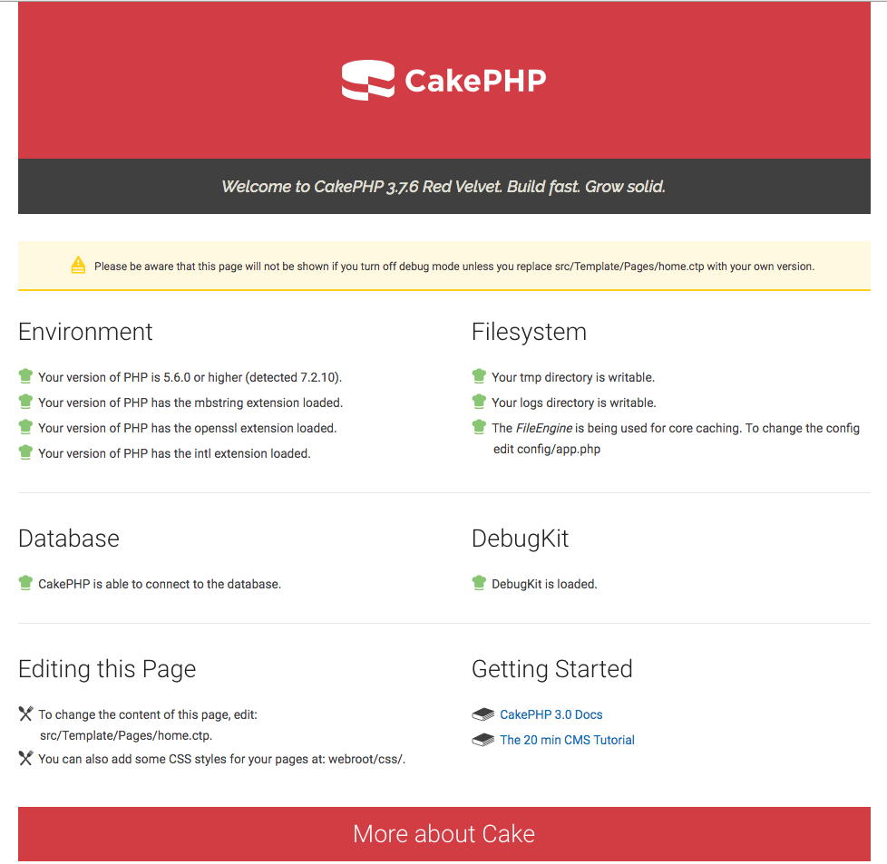 $ vim cakephp3.7/cakephp3/cakephp/config/app.php 'Datasources' => [ 'default' => [ 'className' => 'Cake\Database\Connection', 'driver' => 'Cake\Database\Driver\Mysql', 'persistent' => false, 'host' => 'mysql', #これ /* * CakePHP will use the default DB port based on the driver selected * MySQL on MAMP uses port 8889, MAMP users will want to uncomment * the following line and set the port accordingly */ //'port' => 'non_standard_port_number', 'username' => 'root', #これ 'password' => 'test', #こいつも 'database' => 'my_app', #これな |