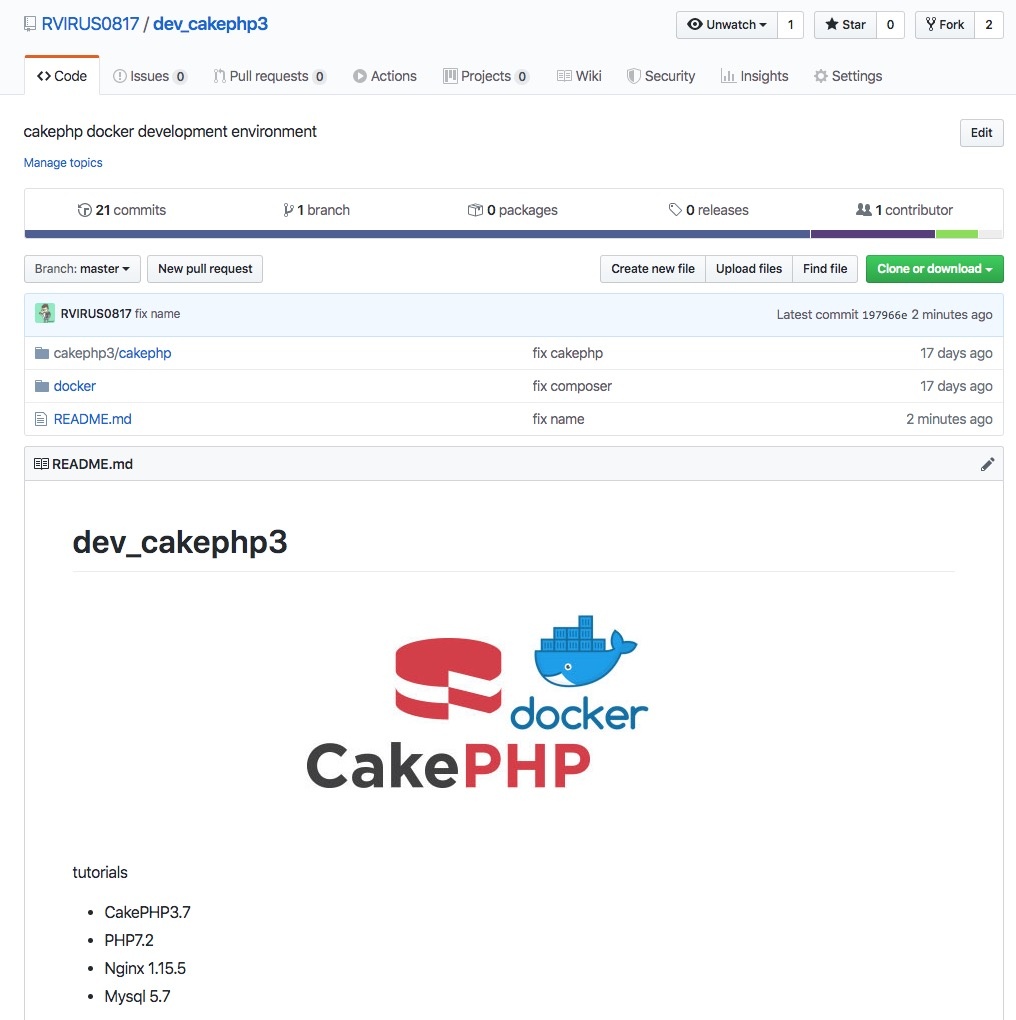 fork my repository $ rm -rf cakephp3.7/cakephp3/cakephp/* $ cd docker $ docker-compose up -d $ docker exec -it cake3-phpfpm sh # cd /var/www/html/cakephp3 # php -r "copy('https://getcomposer.org/installer', 'composer-setup.php');" # php -r "if (hash_file('sha384', 'composer-setup.php') === '48e3236262b34d30969dca3c37281b3b4bbe3221bda826ac6a9a62d6444cdb0dcd0615698a5cbe587c3f0fe57a54d8f5') { echo 'Installer verified'; } else { echo 'Installer corrupt'; unlink('composer-setup.php'); } echo PHP_EOL;" # php composer-setup.php # php -r "unlink('composer-setup.php');" # php composer.phar create-project --prefer-dist cakephp/app cakephp # exit $ mv cakephp cakephp33 $ mv cakephp33 ../ $ rm -rf cakephp $ mv cakephp33 cakephp |
