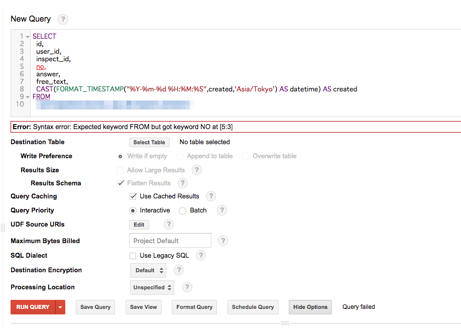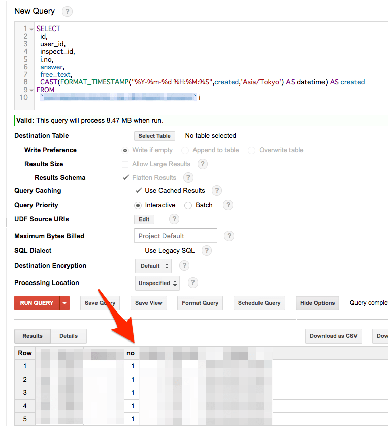 SELECT id, user_id, inspect_id, i.no, #変更 answer, free_text, CAST(FORMAT_TIMESTAMP("%Y-%m-%d %H:%M:%S",created,'Asia/Tokyo') AS datetime) AS created FROM `xxx-xxxx.xxxx_db.hoge_table` i #追加 |