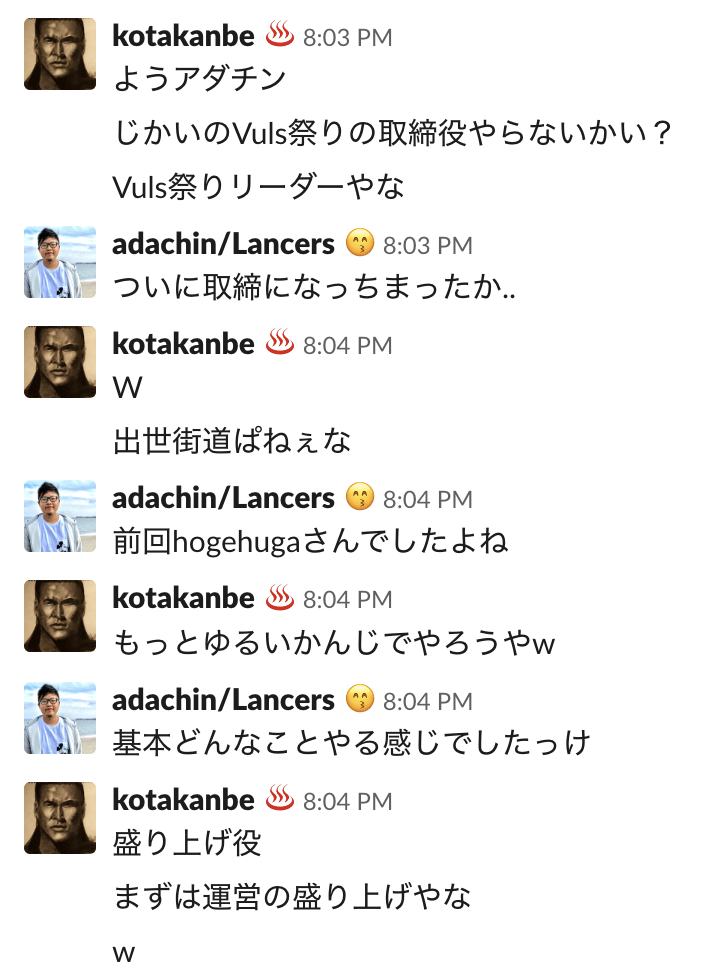 vuls-githubというvuls専用slackチームがあるのですが、ランダムでちょんまげさんに指名されます。(以下のように)それが今回ワタシというわけになります。(まったく何をすればいいのか不明)基本運営の盛り上げ役とあれやれ!動け!みたいな指示をする感じですね。あとはconnpassの更新でスケジュールを作成します。これがなかなかの大変。