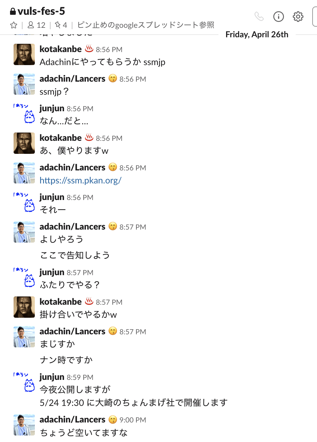 ssmjpというインフラ系勉強会があるのですが、ここで、Vuls祭り#5の開催日を告知します。ただお知らせするだけなのに私のトーク力で盛大に盛り上がりました!その後はIPAさんの書類やら飯と酒の準備で当日を迎えます。