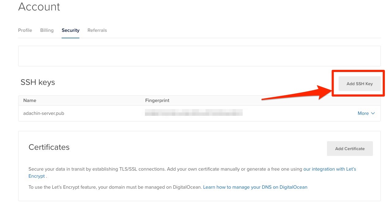 $ curl -X GET -H "Content-Type: application/json" -H "Authorization: Bearer <API>" "https://api.digitalocean.com/v2/account/keys" | jq . { "ssh_keys": [ { "id": 123456, # メモ "fingerprint": "1a:7c:d5:6c:bf:d6:cf:93:49:39:66:cc:dc:ed:c5:04", "public_key": "...", "name": "mojamoja" }, ... ] } |