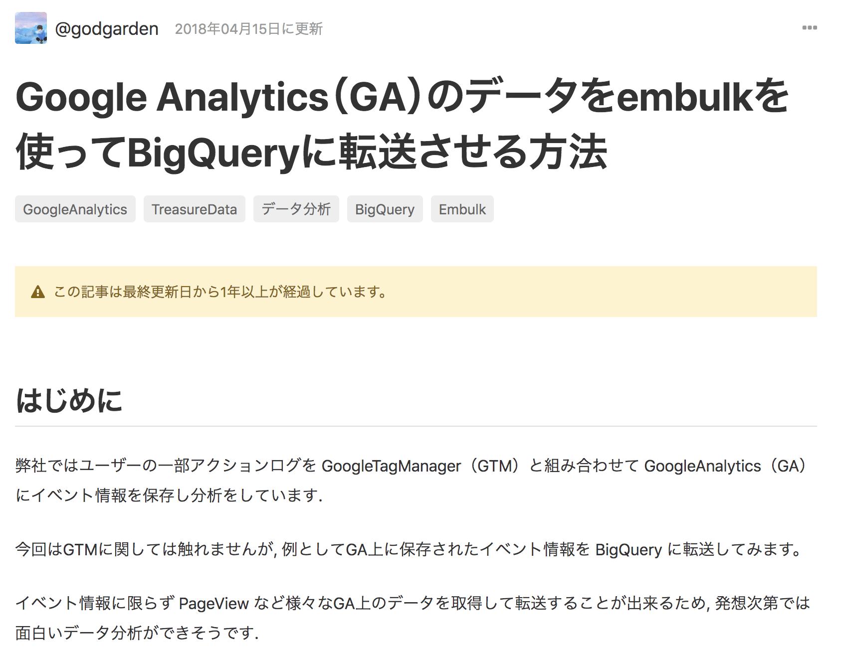 Google Analytics(GA)のデータをdigdag(embulk)でBigQueryにシンクしているのですが、 view_id をもう一つ追加してほしいと依頼がありまして、(以下実装に関してはgodgarden氏の以下を参考に) digdagの for_each を使えば設定ファイル新しく作らなくて済むし、管理も楽だよとのことなのですが、1週間くらいドハマリしたのでブログします。