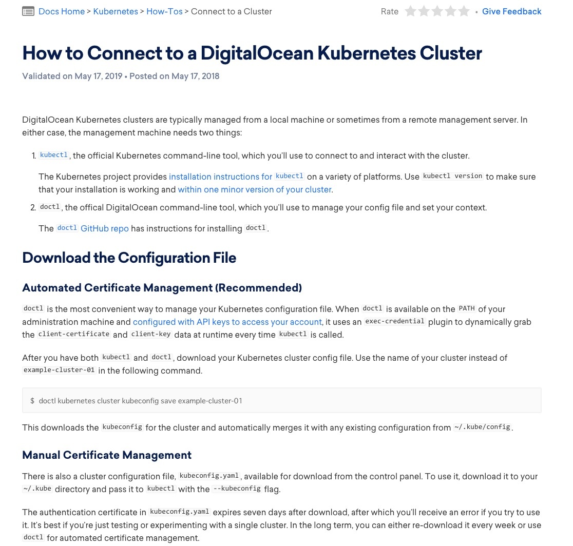 $ doctl kubernetes cluster kubeconfig save cluster-name Notice: adding cluster credentials to kubeconfig file found in "/Users/adachin/.kube/config" Notice: setting current-context to do-sgp1-xxxxxx-cluster |