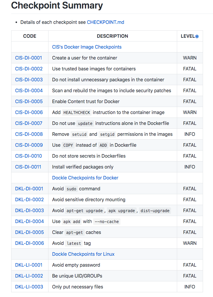 https://github.com/goodwithtech/dockle#checkpoint-summary