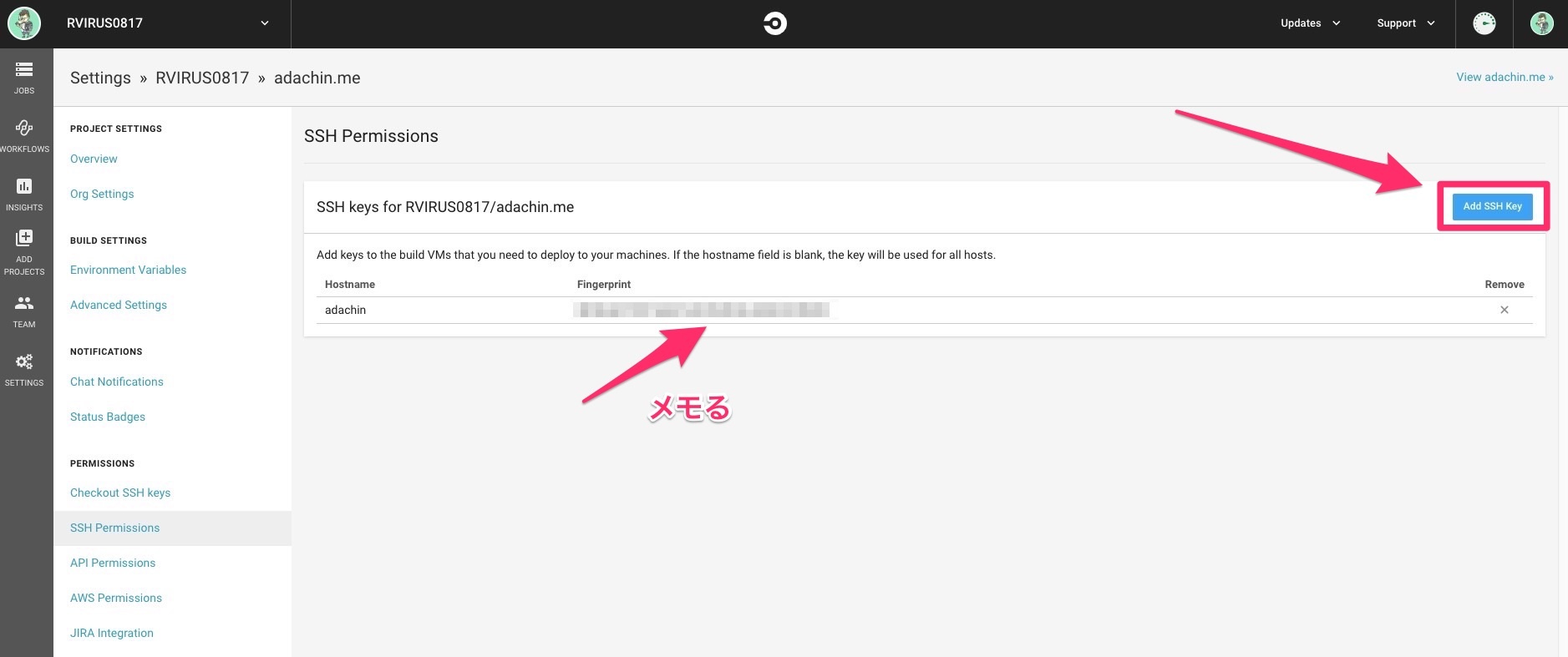 SSHするサーバの秘密鍵を登録しましょう。ハッシュ化されている fingerprints をメモります。