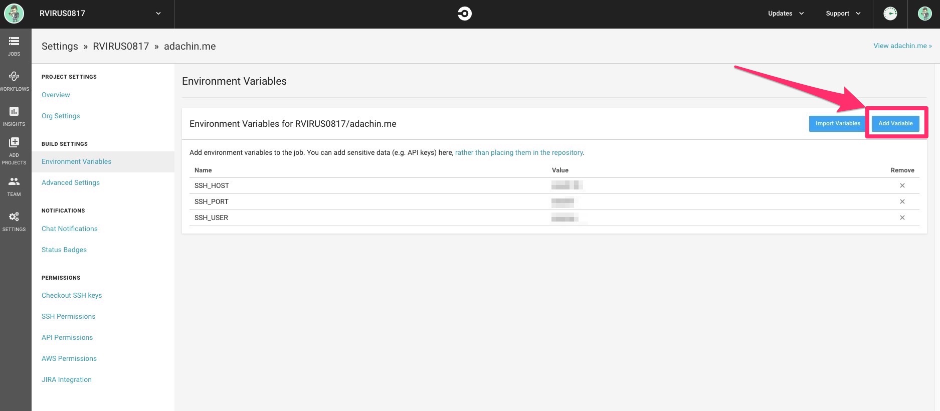 後に必要となってくるSSHのホスト名、ポート番号、ユーザ、SlackのWebhookを環境変数として登録します。
