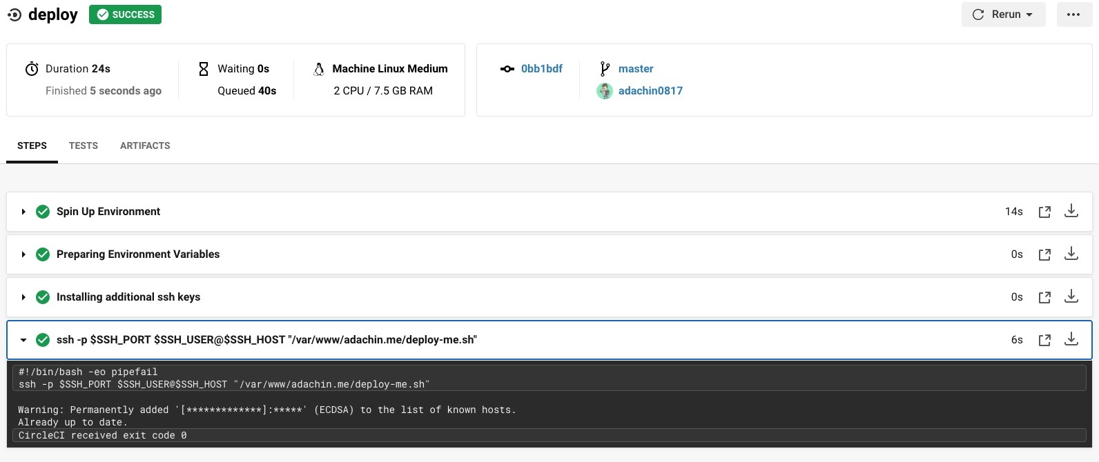 adachin.meというポートフォリオを公開しているのですが、コードはGithubで管理しており、毎回修正するたびにローカルでmasterマージして、サーバーログインしてシェルスクリプトで git pull をやっていたのですが、あまりにも面倒だし時代遅れのため、今回CircleCIを使ってmasterマージされたら自動でサーバーへSSHしてコードをデプロイするように高速で作ってみました。まずは流れ的なものを説明したいと思います。