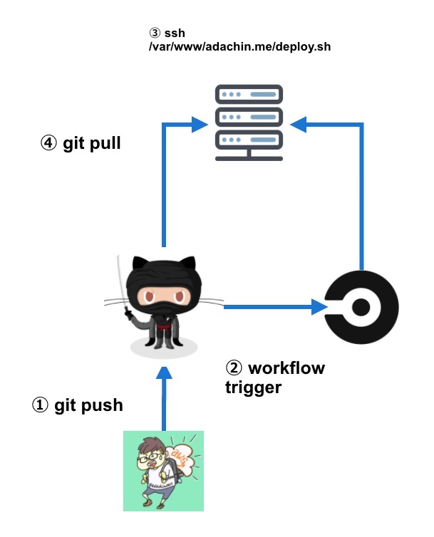 - サーバーにSSHからのdeploy.sh(以下)が叩かれる
