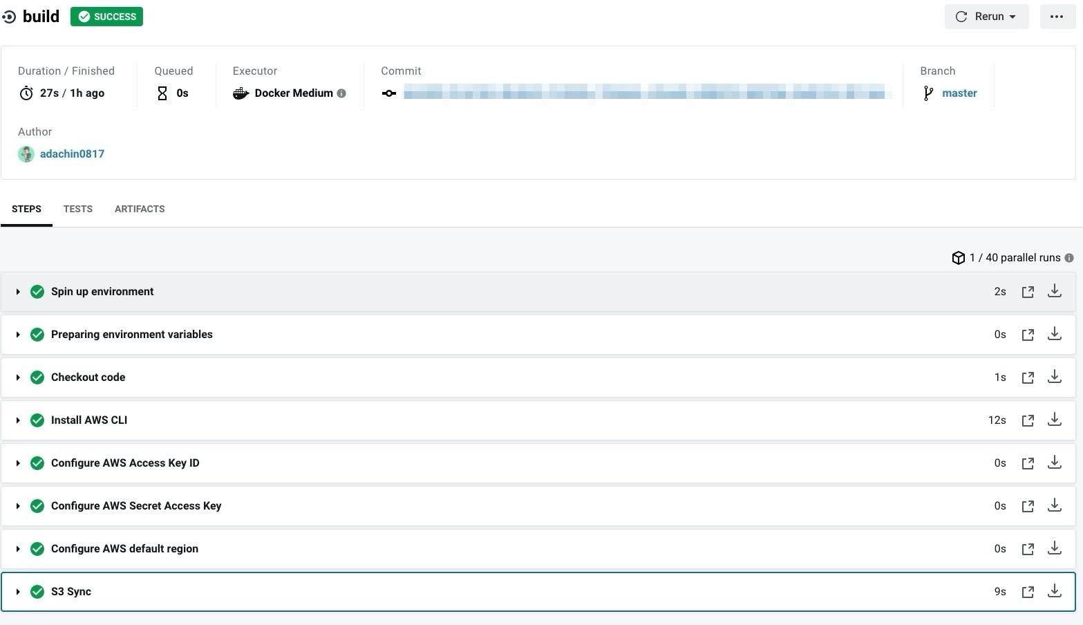 17行目のaws s3 syncのオプションで --delete を指定していますが、GitHubで管理されているソースコードとまったく同じにしたく、ソースに存在しないファイルをバケットから削除したいという理由です。そのままsyncすると不要なファイルが残ってしまうので追記しました。18行目の from ですが、これは実際のソースコードのディレクトリを指しています。 あとはworkflowsでブランチをmasterにすれば自動でソースがアップロードされます。