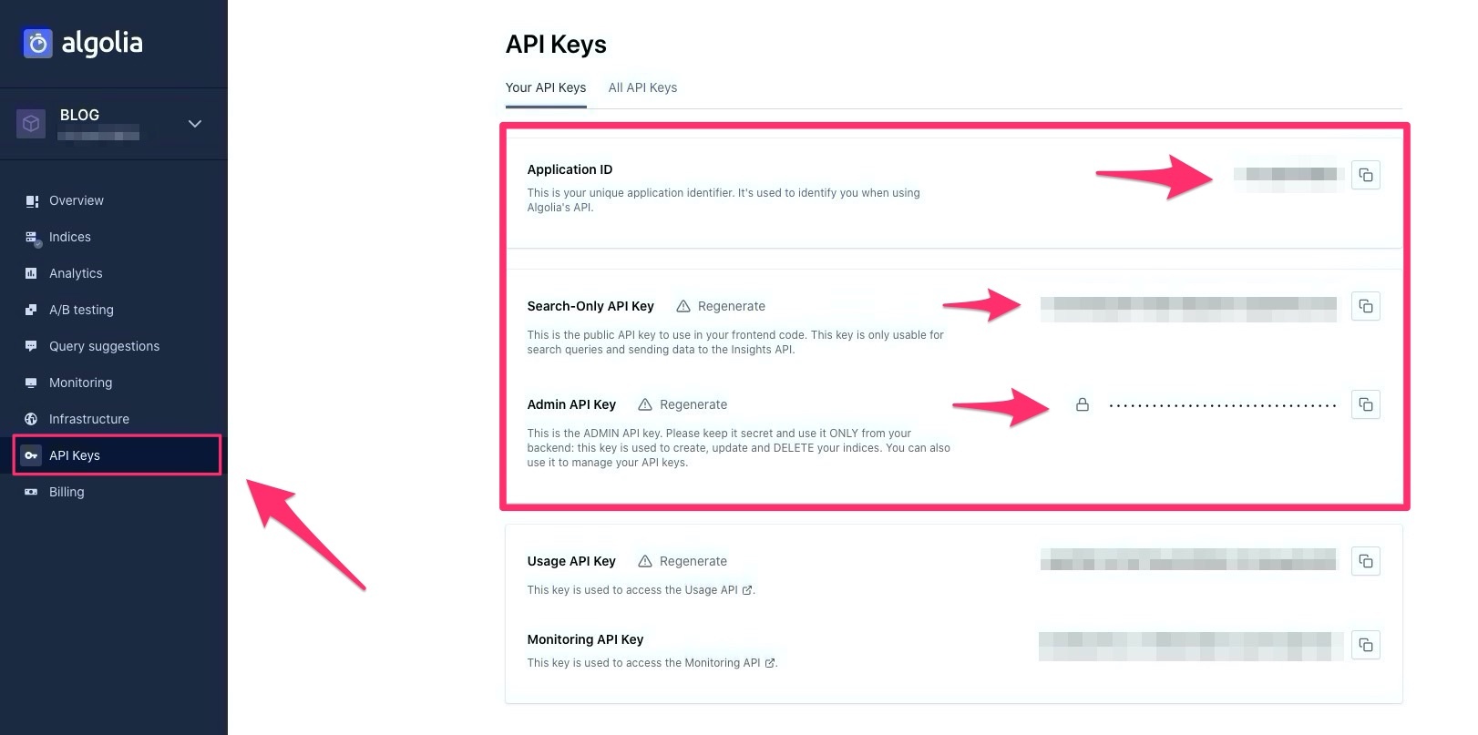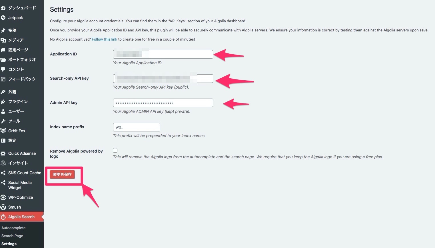 Application ID , Search-Only API Key , Admin API Key この3つをメモります。