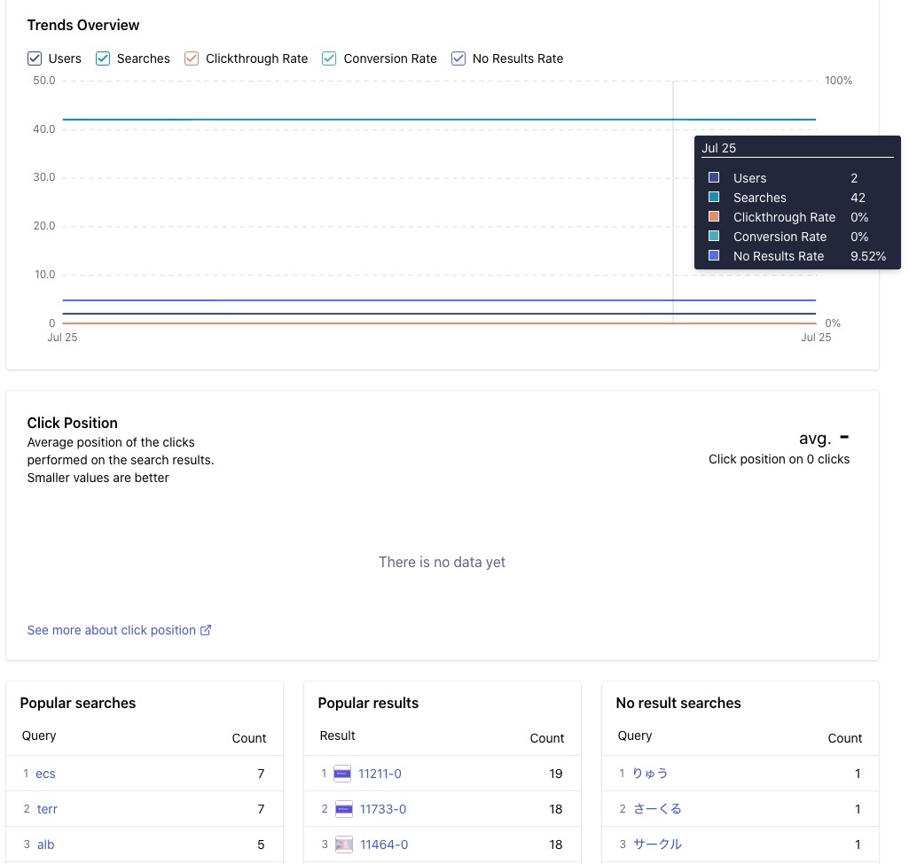 Algoliaのダッシュボードでは検索クエリなどをすべて可視化して分析も可能になっています。