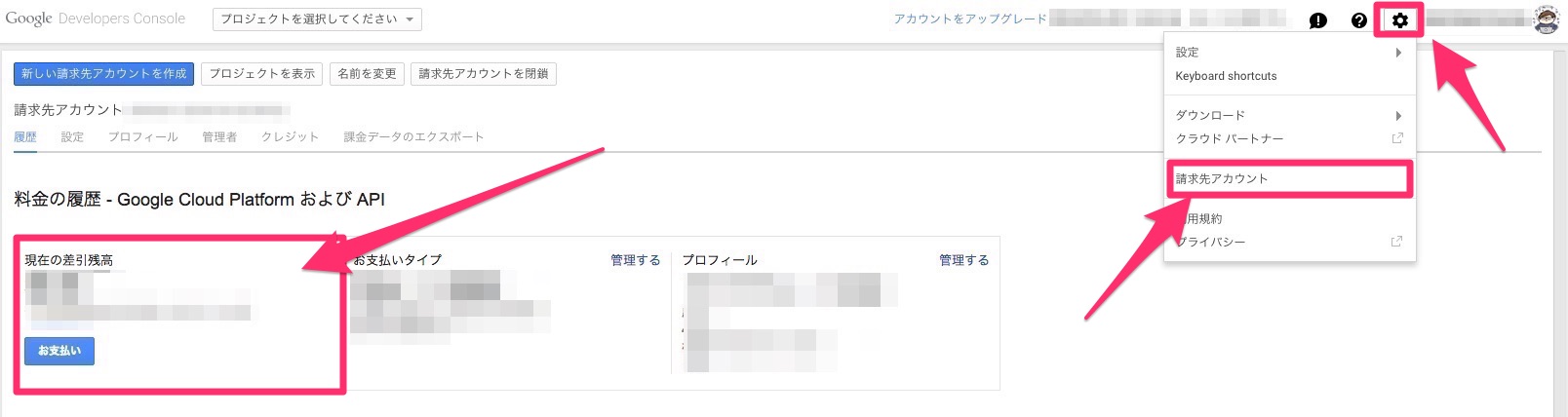 実際いくら使ってるのかはGoogle Developer Toolの設定マークの請求先アカウントで確認できます。