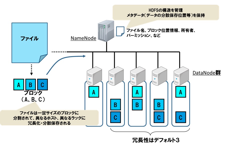 マスターノードであるNameNodeとスレーブノードであるDataNodeで構成されている。 NameNodeは分散ファイルシステムのメタ情報を管理し、DataNodeはデータの実体を保存。 HDFSにファイルを格納する場合、ファイルを一定サイズで分割したデータをブロックとしてDataNodeで保存。
