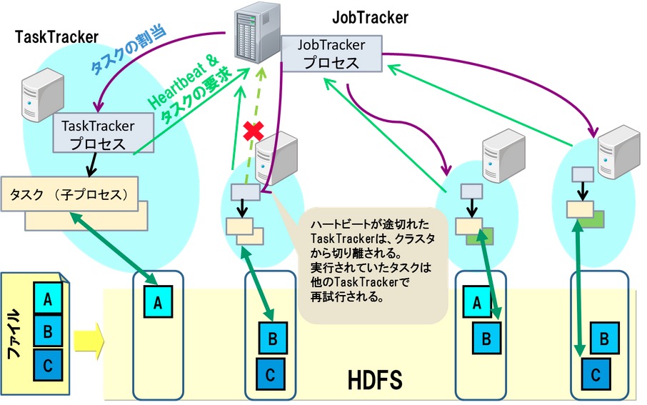 MapReduce処理基盤ではTaskTrackerが故障し、そのTaskTrackerで実行していたタスクが完了できない場合はJobTrackerが他のTaskTrackerに同じタスクを割り当てる。これによりMapReduceジョブ全体を最初からやり直す必要がなく、継続して実行することが可能。
