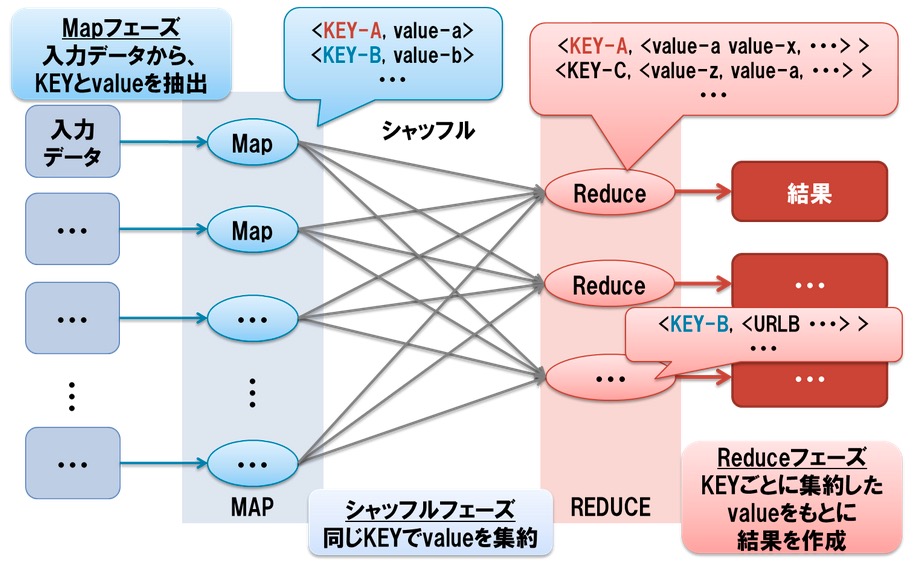 - reduce処理 : map処理のキーごとに集約されたデータに対して何らかの処理を実行する