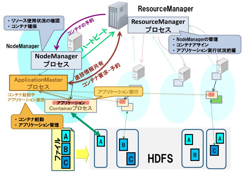 YARNでは、Hadoopクラスタ内のリソースを管理するマスタノードとしてResourceManager、処理ノードを管理するスレーブノードとしてNodeManagerで構成されている。 アプリケーションを管理するノードApplicationMasterはリソース状況を確認しつつ処理を実行するContainer(コンテナ)の確保をResourceManagerに要求し、 ResourceManagerはNodeManagerからのリソース利用状況をもとに、どのノードでContainerを起動するか情報を回答する。 この回答を従い、ApplicationMasterは処理ノードでコンテナ起動を要求してアプリケーションを実行。