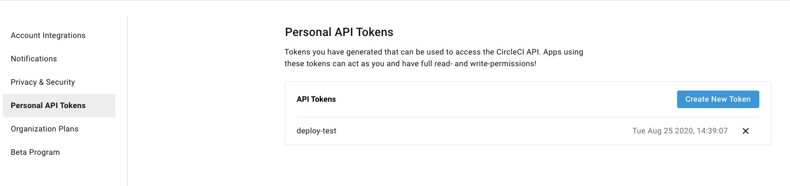 まずはCircleCIのダッシュボードから左下のプロフィール画面をクリックすると以下のようにPersonal API Tokensがあるので発行しましょう。