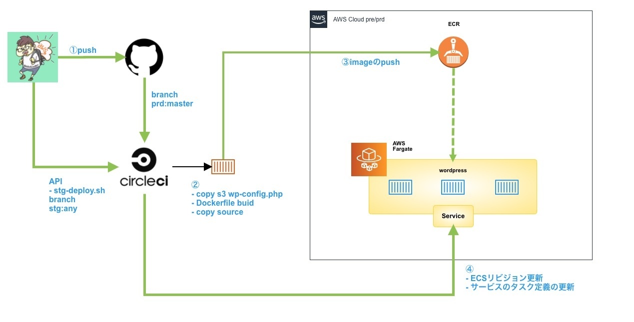 以下のように、今までCircleCIでECS/Fargateでのステージングデプロイはfilters branchesでdevelopブランチに対してマージを出していました。それに本番反映するためにdevelopブランチをmasterブランチに対してプルリクマージを出すというgit flowで運用していました。(なかなかの手間が…)