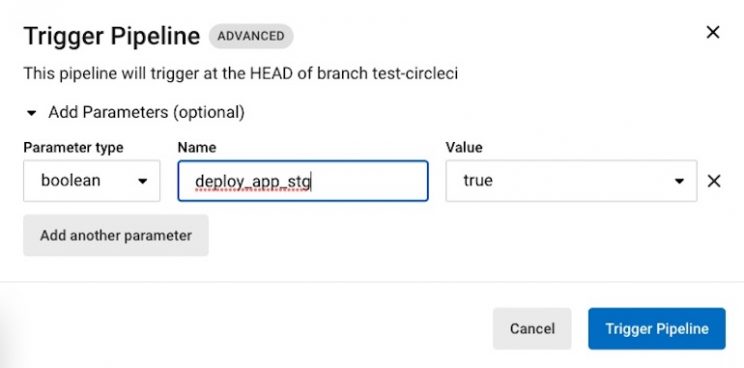 51行目からfilters branchesを削除して、 pipeline.parameters という変数を指定することで、curlで指定したtrueが代入されます。これによってステージングへのデプロイは特定のブランチに対していくらpushしても、デプロイされないようにwhenで条件分岐をしています。
