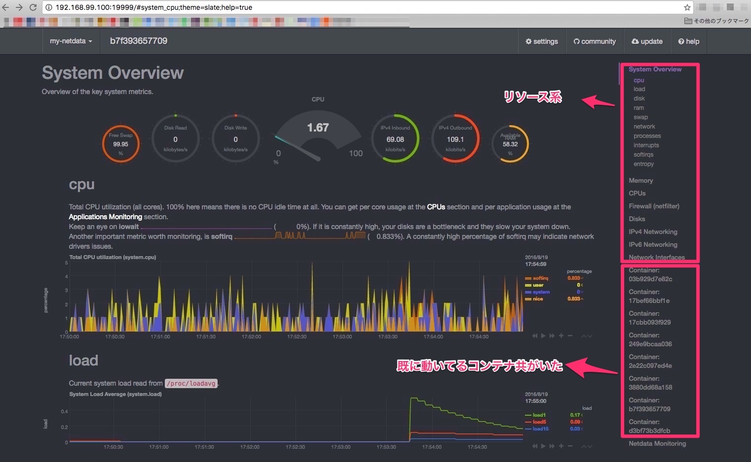 ダッシュボードはbootstrapでできてるそうです。しかしカッコいい!スクロールすると細かくリソース系が表示されてます。動いてるコンテナ共も既にモニタリングされてました。(大まかな部分のみ)