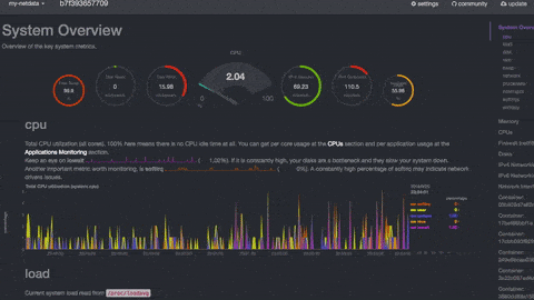 $ docker run -d --cap-add SYS_PTRACE --cpuset-cpus=1 --memory=1024mb \ -v /proc:/host/proc:ro \ -v /sys:/host/sys:ro \ -v /var/run/docker.sock:/var/run/docker.sock \ -p 19999:19999 titpetric/netdata |