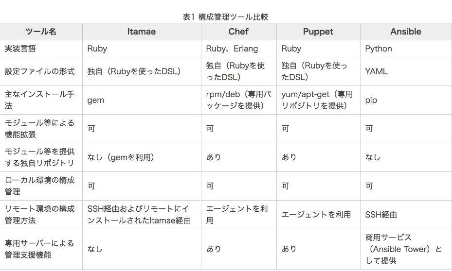あとは最近出た構成ツールなのでpuppet,chef,itamaeの弱点を押さえているので