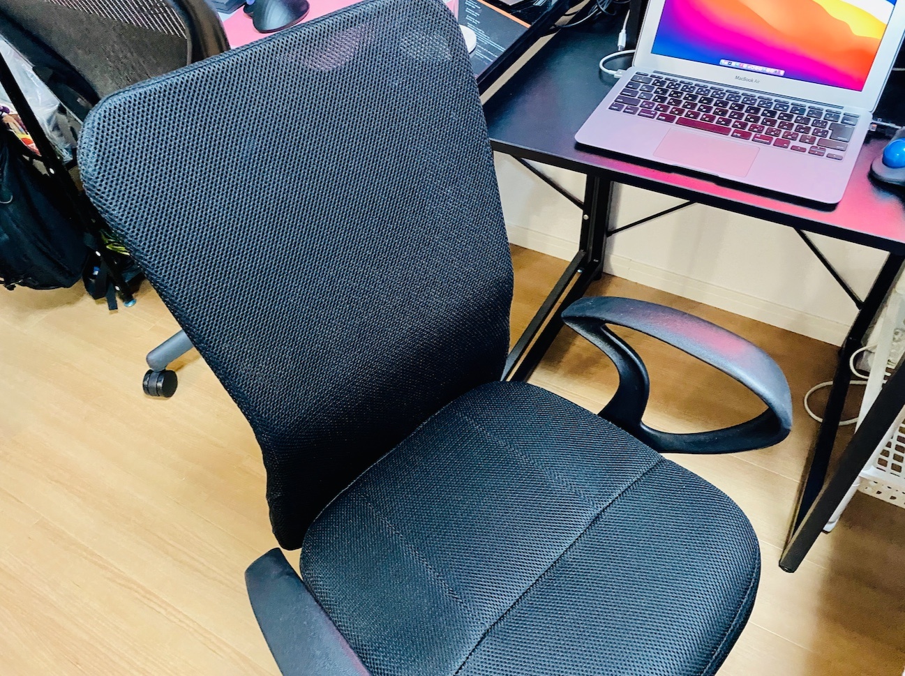 次は問題である椅子になります。今回の椅子ですが、デスクが幅60センチということもあって、よし60センチまでの椅子買っちゃおう!と勢い余ってポチるとゲームオーバー。実際は54センチでした… 支え棒を考慮する必要があるので、焦って購入はしないように!
