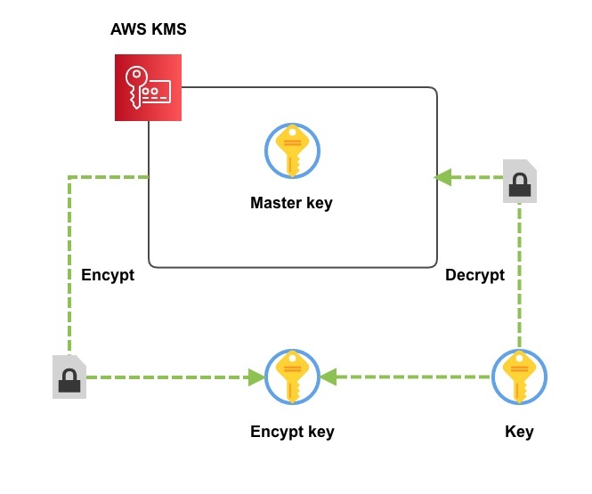 簡単に言うとDBのパスやらクレデンシャルなどの機密情報などをサーバーで管理してしまうと雑多になってしまうし、不正アクセスされて流出されたら終了です。そのためにAWS KMSを利用することで、万が一、流出されてしまっても、キーを暗号化することで解読不能にしてトレースできるのがベストです。インフラやっている人はHashicorpのVaultかな!と思うかもしれませんが、まさにそれです。以下概念見ていきましょう。