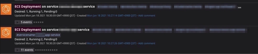 Eventsはアラートや、AWSの各アクティビティを残す機能です。なので障害があったなどメモも残すことができます。そして前提としてAWSアカウントをIntegrateionsに紐付けないと出現されません。やり方は以下を参考にしてもらえばと思います。そうすると上記のようにECS Deployment 〜とイベントが出てきます。この通知はコンテナがローリングアップデートが発生した回数が表示されるのでこれを閾値としてアラート設定すれば完了となります。