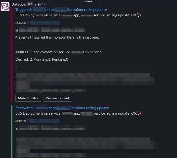 最近Datadog活用し始めてます。ECS/FargateにてCircleCIでコンテナのデプロイが完了して、毎回AWSコンソールにログインし、ローリングアップデートしてコンテナが入れ替わるまで目視していました。が!このAWSで目視する過程をなくしたいといろいろ調べていると、どうもLambdaで実装している方が多く、作るのがめんどくさいということもあって、Datadogでサクッとできないのかしら..と調査していたら、 Events から通知できることを知りましたのでブログしたいと思います。ちなみにECS/Fargateのコンテナ内部のリソース監視方法は以下。
