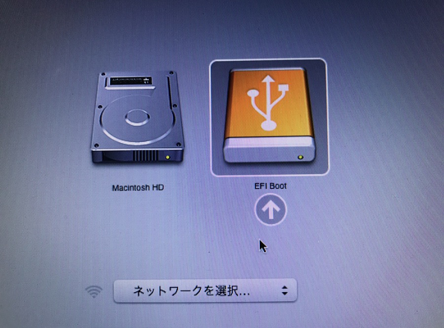 再起動してMacの起動オンが鳴ったらoptionキーを押すと以下のような画面になるはず。出てきたら先程のDiskを選択すること。