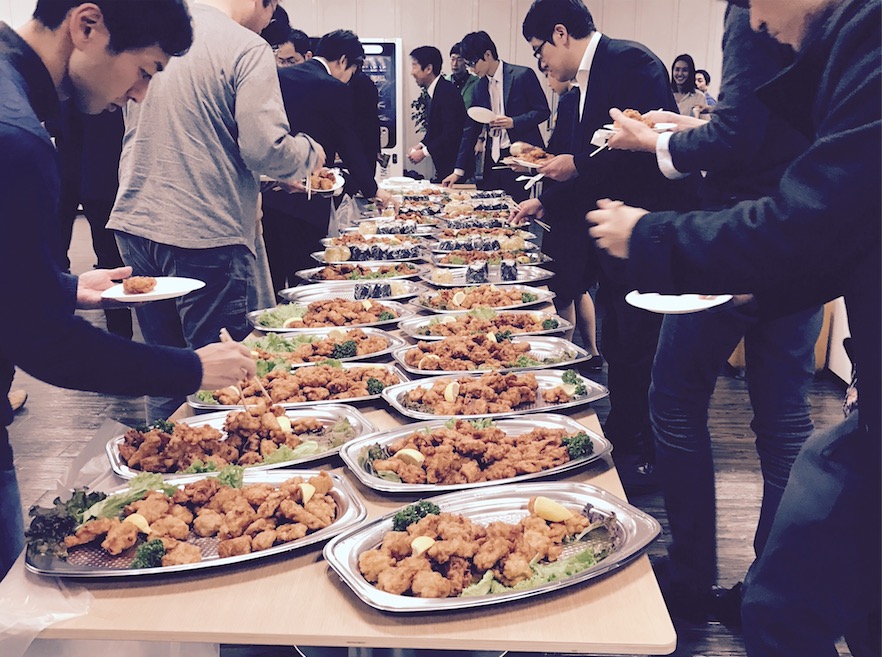 軽食はお酒、唐揚げ、おにぎりうまうま。(あっという間になくなる)