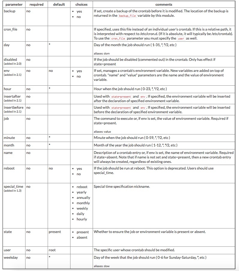 - このモジュールを使用してcrontabおよび環境変数を管理します。 このモジュールでは環境変数と名前付きcrontabを作成、更新、または削除することができます。