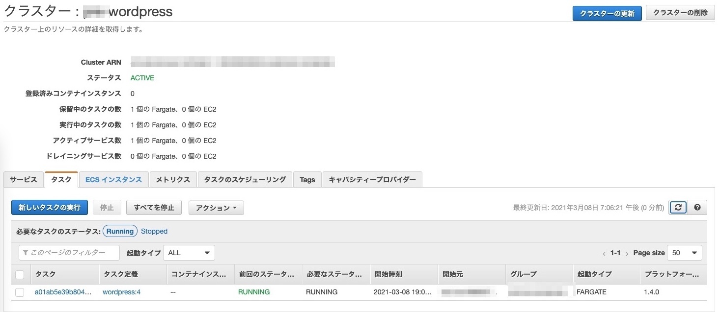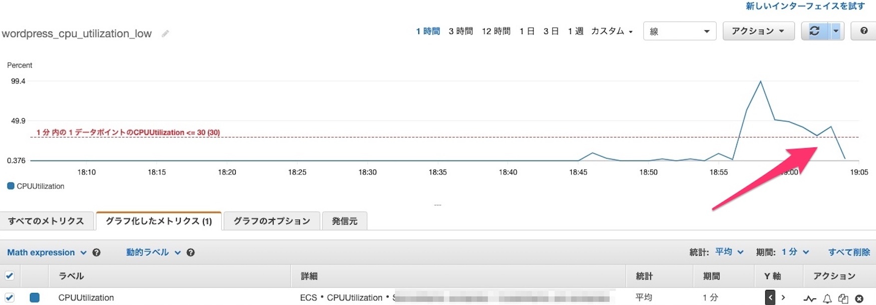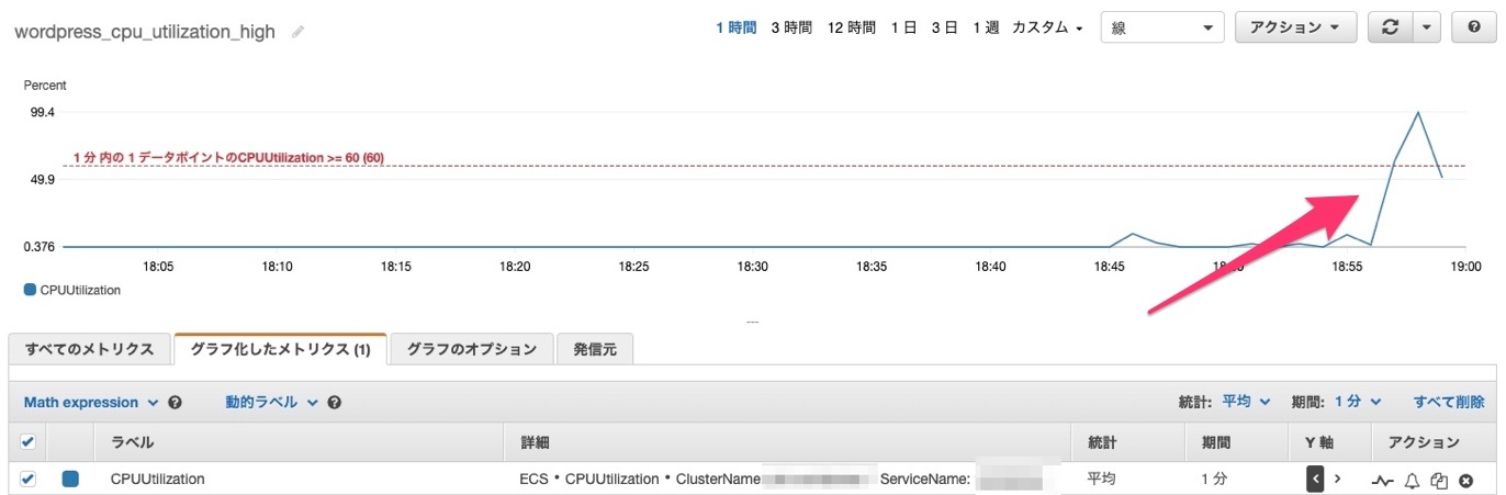 テストとして、WordPressコンテナでCPU 60%以上負荷がかかったらコンテナ数(タスク)2台にしてCPU 30%以下でコンテナ数(タスク)1台にするよう作ってみました。使用するResourceは aws_appautoscaling_target と aws_cloudwatch_metric_alarm になります。実際に動作確認してみましょう。