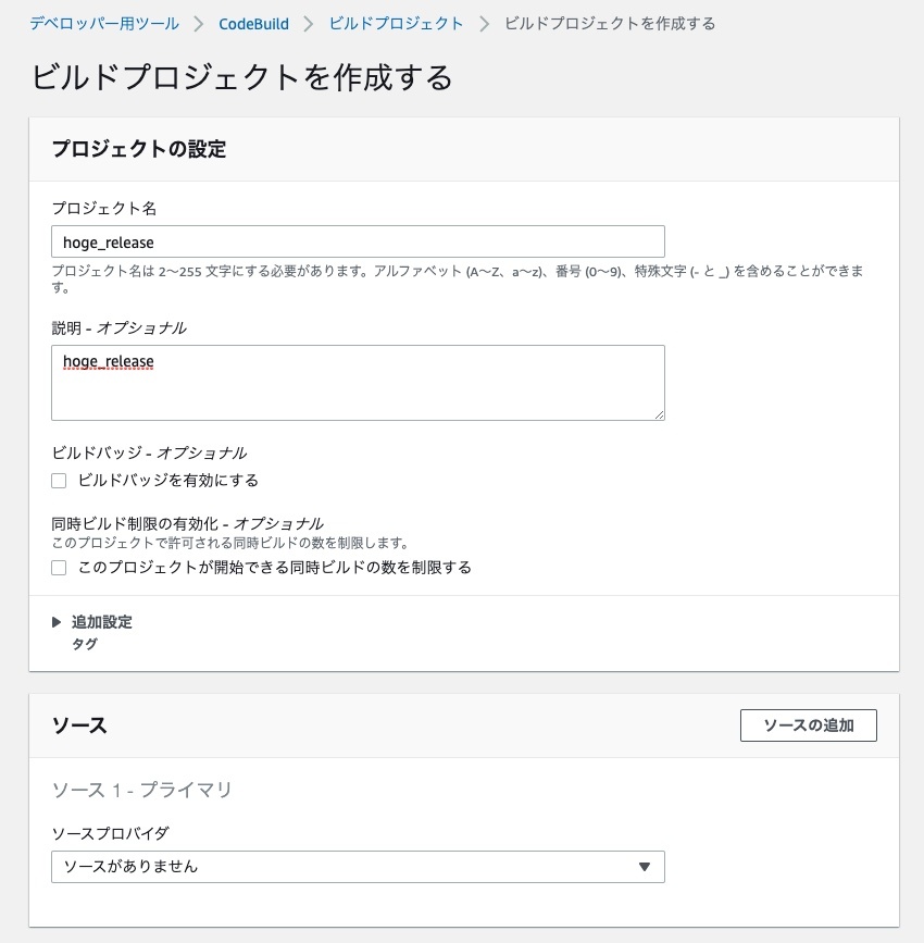 プロジェクトは何でも良いです。チェック項目は特にしません。EFSは既にリポジトリがマウントされている前提ですので、ソースプロバイダはGitHubのリポジトリを連携できますが、リリース時に何個もリポジトリがあるとCodeBuildのプロジェクトを作成しなければならなく、管理が雑多になってしまうため、1つのプロジェクトでかつCircleCIでデプロイメントできるようにしました。なので今回は設定しなくてOKとなります。