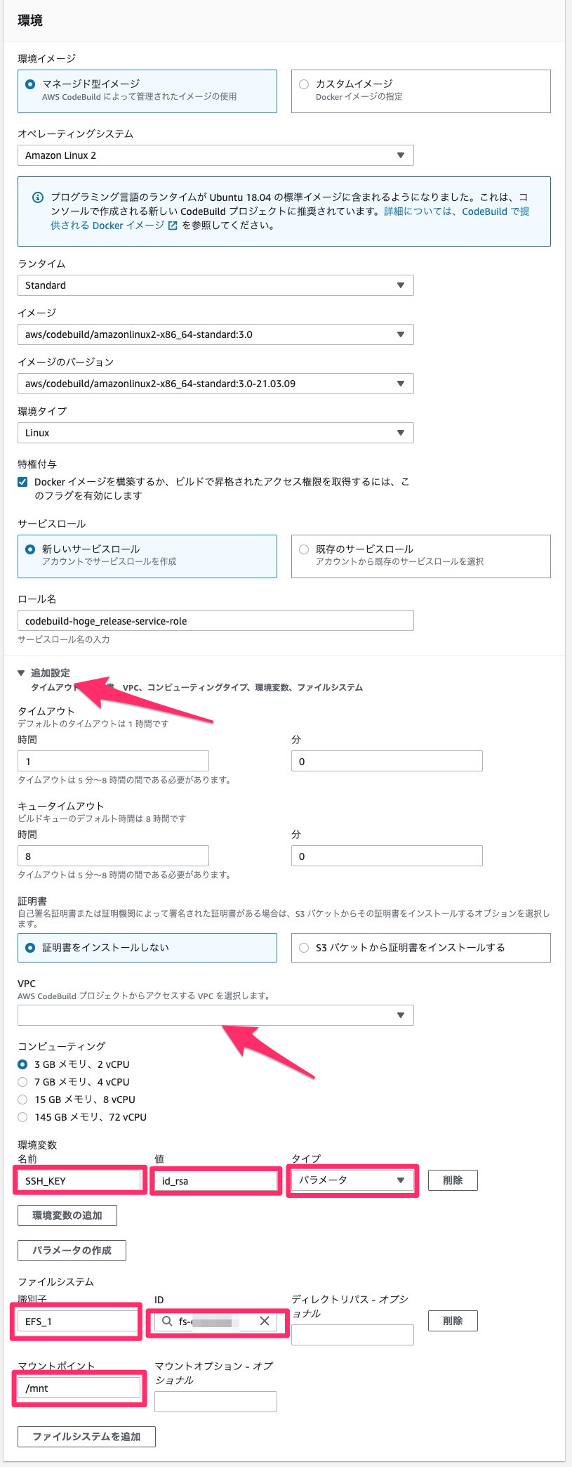OSはAmazon Linux 2にしました。特権付与はEFSでマウント時にアクセス権限を付与しないとプロジェクトが作成されないので必ずチェックしましょう。追加設定ではVPCは各自設定してください。環境変数では先程System Managerで設定した秘密鍵をパラメータとして追加します。他にも環境変数としてgithubのメールアドレスとユーザー名も追加しましょう。ファイルシステムは識別子がEFS_1でIDは選択すると候補が出るので指定します。マウントポイントも忘れずに。