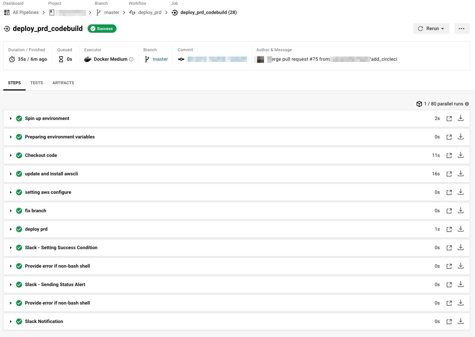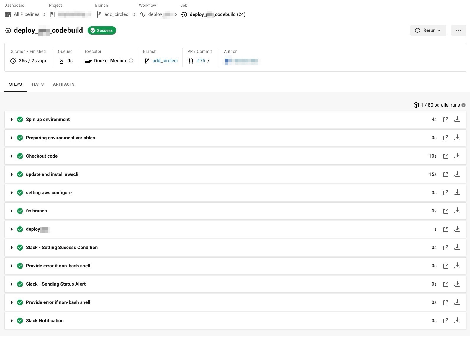 $ ./stg-deploy.sh test { "number" : 36, "state" : "pending", "id" : "xxxxxxxxxxxxxxxxxxxxx", "created_at" : "2021-03-17T13:36:00.299Z" } ブランチ名/ add_circleci のeStgデプロイを開始しました。 |