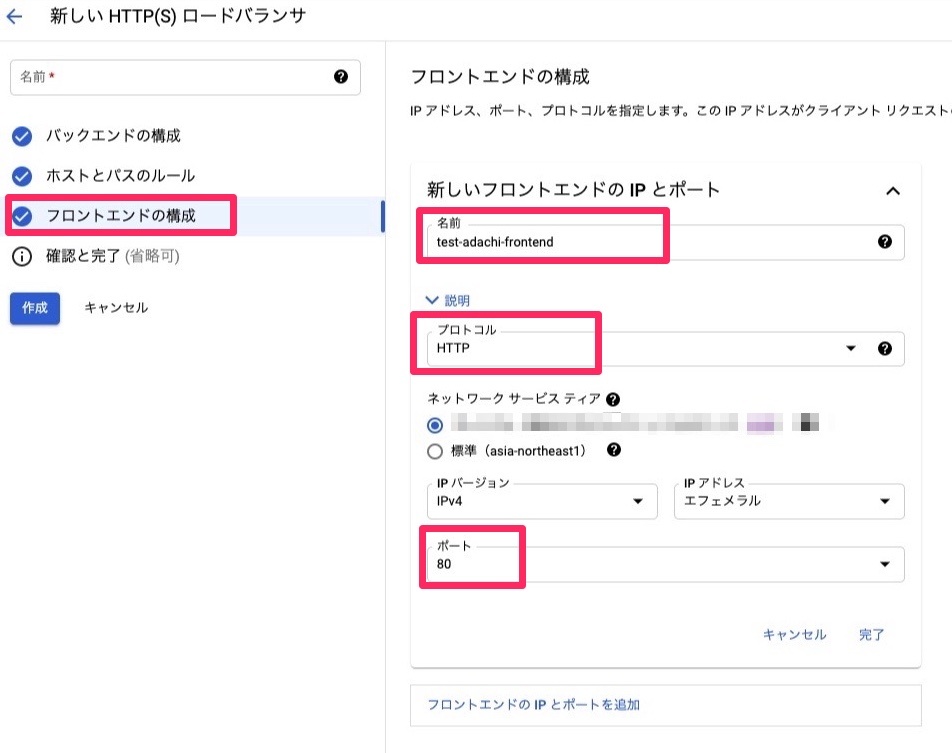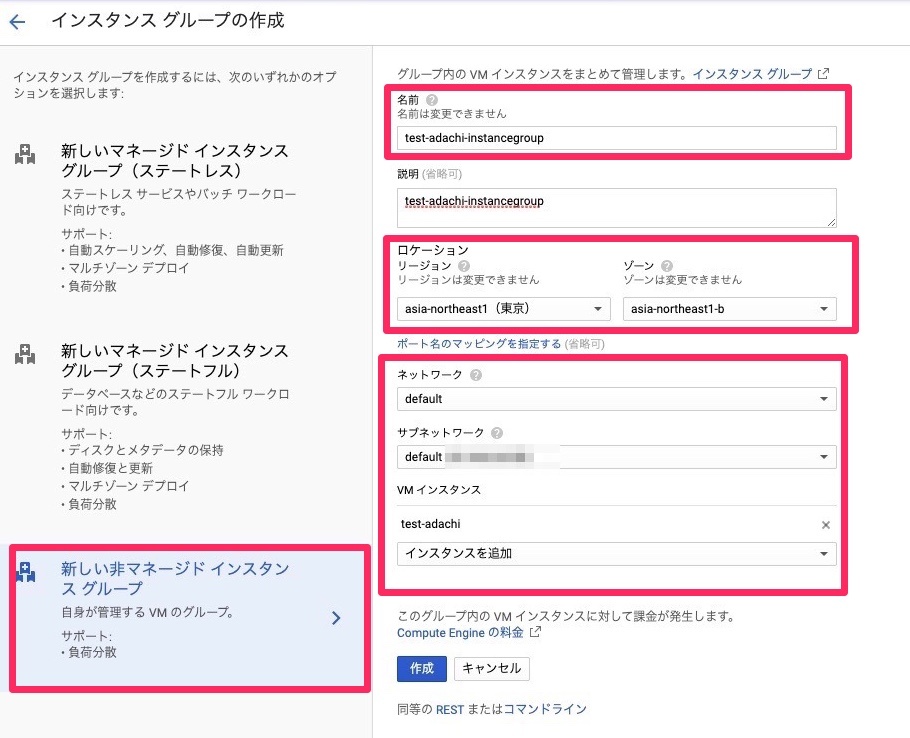 インスタンスグループはAWSでいうターゲットグループになります。なので上記作成したVMインスタンス2台を指定しましょう。ちなみにマネージド インスタンスグループ(ステートレス)ではオートスケールの細かい設定やヘルスチェックの設定等行えます。今後こっちに移行させたほうがが良さそうですね。