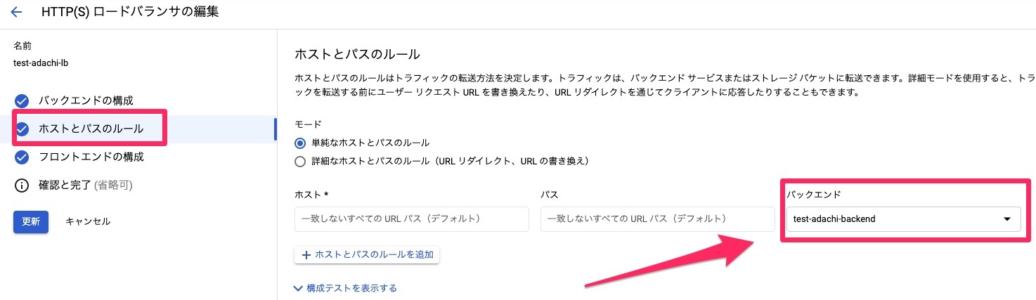 ここではホストやパスに対してURLを書き換えたり、リダイレクトなど細かく転送ルールの設定ができます。AWSだとリスナールールになりますね。今回は特にリダイレクトなどはしないので上記のバックエンドを指定しましょう。メンテページリダイレクトとかもできそうですね。