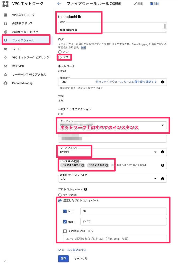 ロードバランサー用のファイアウォールを作成していきましょう。ターゲットタグはネットワーク上のすべてのインスタンスを選択し、ソースIPの範囲はLBのSRCIPである35.191.0.0/16, 130.211.0.0/22を指定します。以下決まっているので覚えましょう。プロトコルポートは80のみに絞ります。