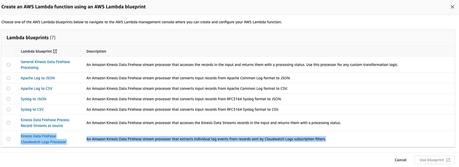 - Kinesis Data Firehose Cloudwatch Logs Processor