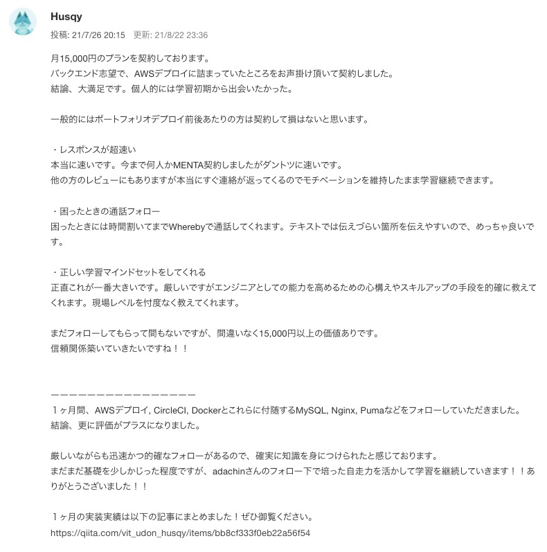 そして手厚くフォローし続けた結果、MENTAでのレビューは温かいお言葉をたくさん頂くことができました。こちらこそ至らない部分もあったと思いますし、メンティーさんからもたくさんの気づきを得ています。少しでもエンジニアとして意識してほしいこと、技術者とはどうあるべき姿なのか、そのベースを元に何のために技術を学ぶのか、など全体的にアプローチできてよかった!と感じております。