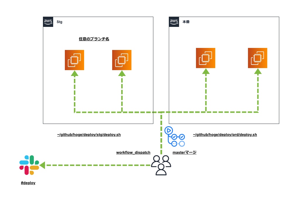 ※例としてGitHub Flowによる開発方法、各EC2はPublicサブネット配下にあり、SSHができる環境です。アプリケーションはPHP7.4/Laravelとします。