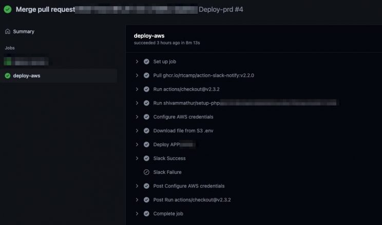 name: Deploy-prd #デプロイ時のデバッグ #on: # pull_request: on: push: branches: [master] #masterマージで発動 env: SLACK_WEBHOOK: ${{ secrets.PRD_SLACK_WEBHOOK_URL }} SLACK_USERNAME: prd-deploy SLACK_CHANNEL: deploy SLACK_ICON: https://avatars.githubusercontent.com/u/44036562?s=280&v=4 jobs: deploy-aws: runs-on: ubuntu-latest steps: - uses: shivammathur/setup-php@v2 with: php-version: '7.4' - uses: actions/checkout@v3 with: fetch-depth: 0 - name: echo key env: PRIVATE_KEY: ${{ secrets.SERVER_SECRET_KEY_AWS }} run: | mkdir ~/.ssh && echo "$PRIVATE_KEY" > ~/.ssh/private_key && chmod 600 ~/.ssh/private_key - name: Configure AWS credentials uses: aws-actions/configure-aws-credentials@main with: aws-access-key-id: ${{ secrets.AWS_ACCESS_KEY_ID }} aws-secret-access-key: ${{ secrets.AWS_SECRET_ACCESS_KEY }} aws-region: ap-northeast-1 - name: Download file from S3 .env run: | aws s3 cp s3://prd-hoge/app/prd-env ./.env --quiet - name: Deploy App env: PRIVATE_KEY: ${{ secrets.SERVER_SECRET_KEY_AWS }} run: | sh ./deploy/prd/deploy.sh - name: Slack Success if: ${{ success() }} uses: rtCamp/action-slack-notify@v2 env: SLACK_TITLE: Prd deploy Success SLACK_COLOR: good - name: Slack Failure if: ${{ failure() }} uses: rtCamp/action-slack-notify@v2 env: SLACK_TITLE: Prd deploy Failure SLACK_COLOR: danger # sshデバッグのためコメントアウト # - name: Setup tmate session # uses: mxschmitt/action-tmate@v3 |