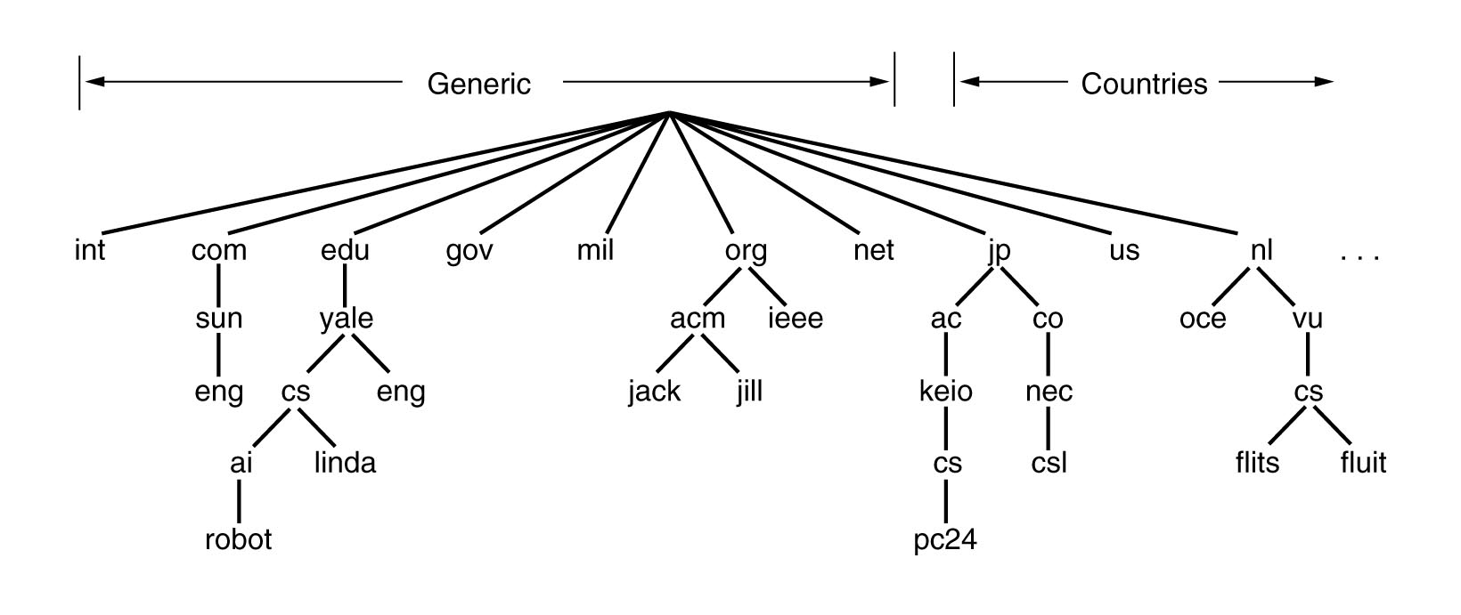 DNSはRFC1034と1035で定義され、利用方法としては名前をIPアドレスに対応付けするためにパラメータとしてresolverと呼ばれるライブラリ手続きを呼び出す。resolverはUDPパケットをローカルのDNSサーバに送り、名前を探し、IPアドレスをresolverに返す。relsolverは呼び戻し元にそのIPアドレスを返す。