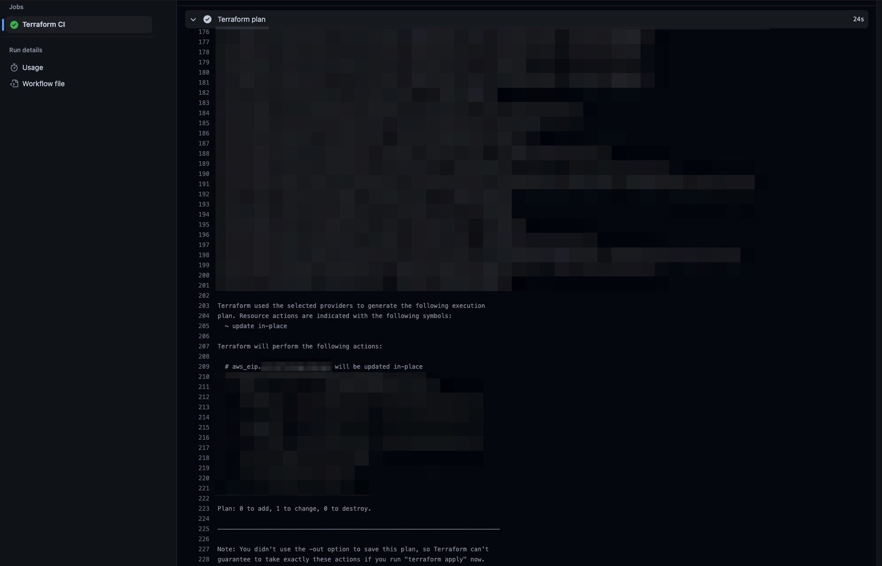 また、validateやplan時に -no-color を指定していますが、GitHub Actionsのログがうまく表示されないため色なしで出力しています。