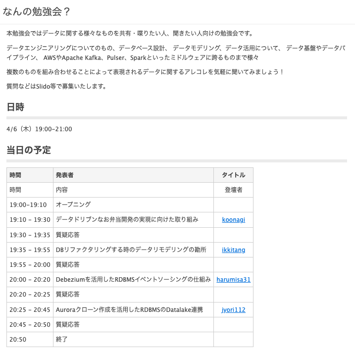 さて、今回はスターフェスティバル x ネットプロテクションズさんの、「突撃!隣のデータ設計・活用勉強会 vol.1」に参加してきました。ちなみにスタフェスのエンジニアメンバーとは@ex_takezawaさん含めて、PHPカンファレンス仙台で飲んだのと、自分の経験として前職でData Lake(Digdag,Embulk,Redash,BigQuery,Athena)の運用・改善をしておりました。非常に濃い内容で勉強になりましたので、イベントレポートさせていただきます。