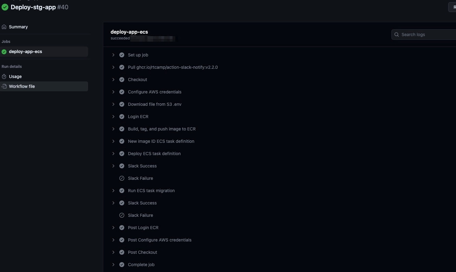 70行目ではタスク定義からローリングアップデートを実施します。 wait-for-service-stability をtrueにすることで、ECSサービスの安定稼働するために実行完了を待つようになります。ですが、Stg環境であれば安定稼働必須ではないはずなのと、完全に切り替わるまで少し時間がかかるので、この設定は不要かもしれないですね。と思いきや、単純にfalseにするとローリングアップデートの処理を実行してActions側は終了になってしまいます。なので、切り替わるのが終わるまで待ったほうが分かりやすいのでtrue必須になりますね。
