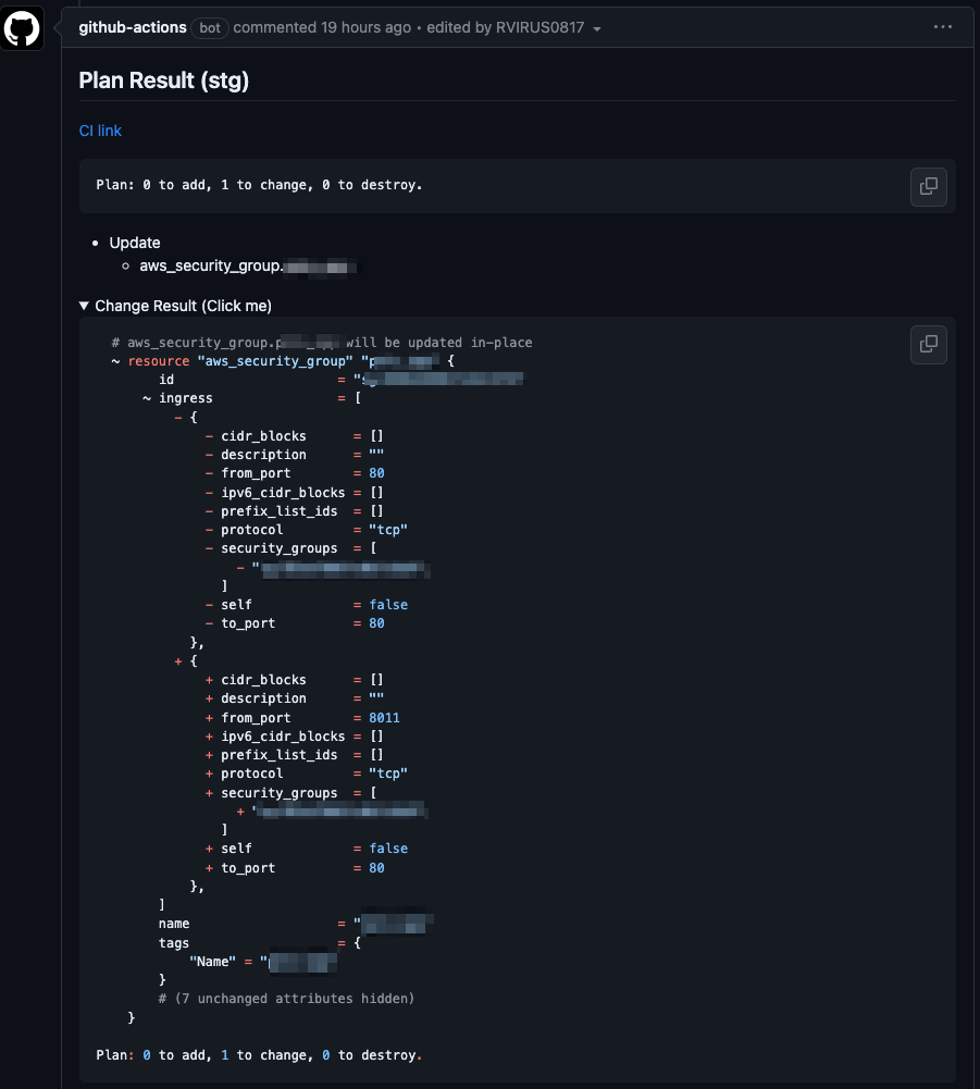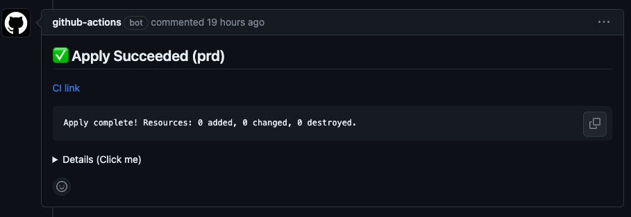 66行目で実際にtfcmtコマンドを使ってterraform planしていくわけですが、今回はstgとprdが別ディレクトリで管理しているため、 varでターゲットを指定しないと片方の関係しか通知通知が来ません。そこで、 引数で対象となる特殊変数を指定することで実行されるようになります。今回はstgなので、 -var "target:stg" を追加します。 -patch は既存のコメントを上書きしてくれるので必須にしましょう。 GITHUB_TOKEN はGitHub側で自動生成するので、こちら側は特に設定する必要はありません。